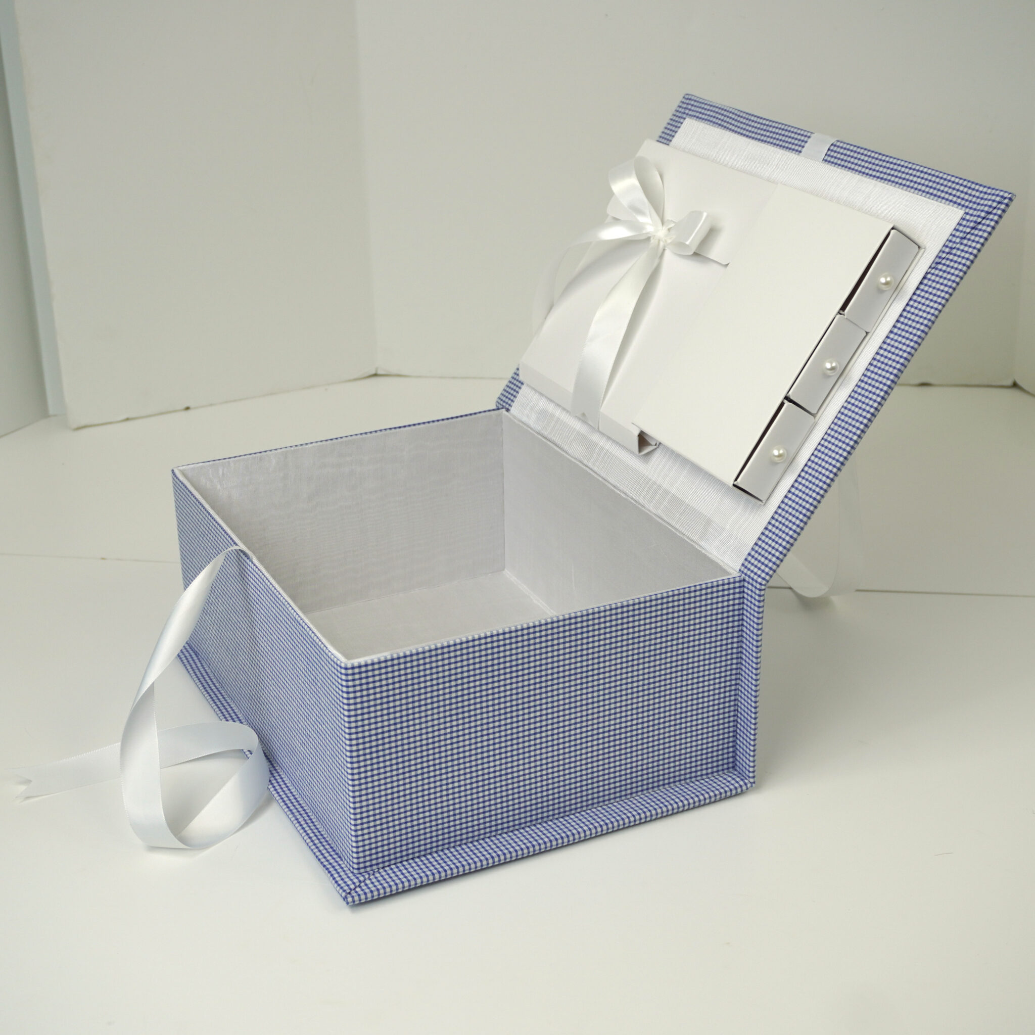 Medium blue seersucker check baby memory box shown open, with white fabric-lined interior, inner keepsake compartments, and white satin ribbon closure.