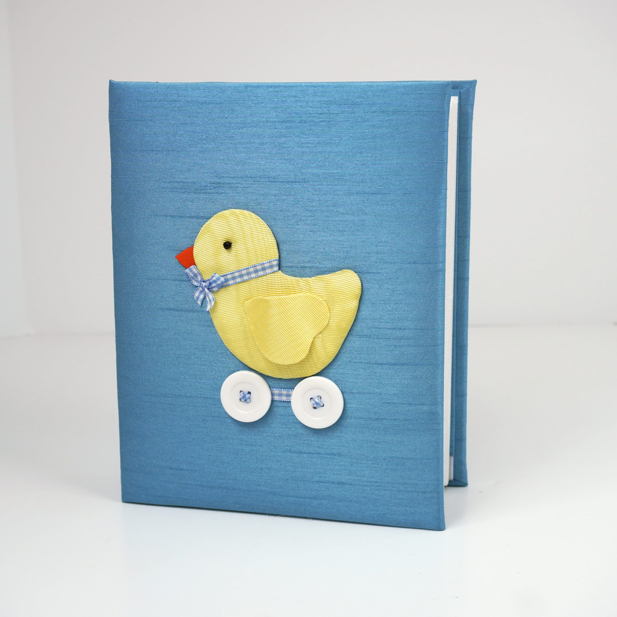 This beautiful photo album is made by hand with the highest quality shantung fabric decorated with a baby chick on wheels. This baby photo album is available in blue, pink and white shantung and is decorated with an adorable yellow chick on wheels.