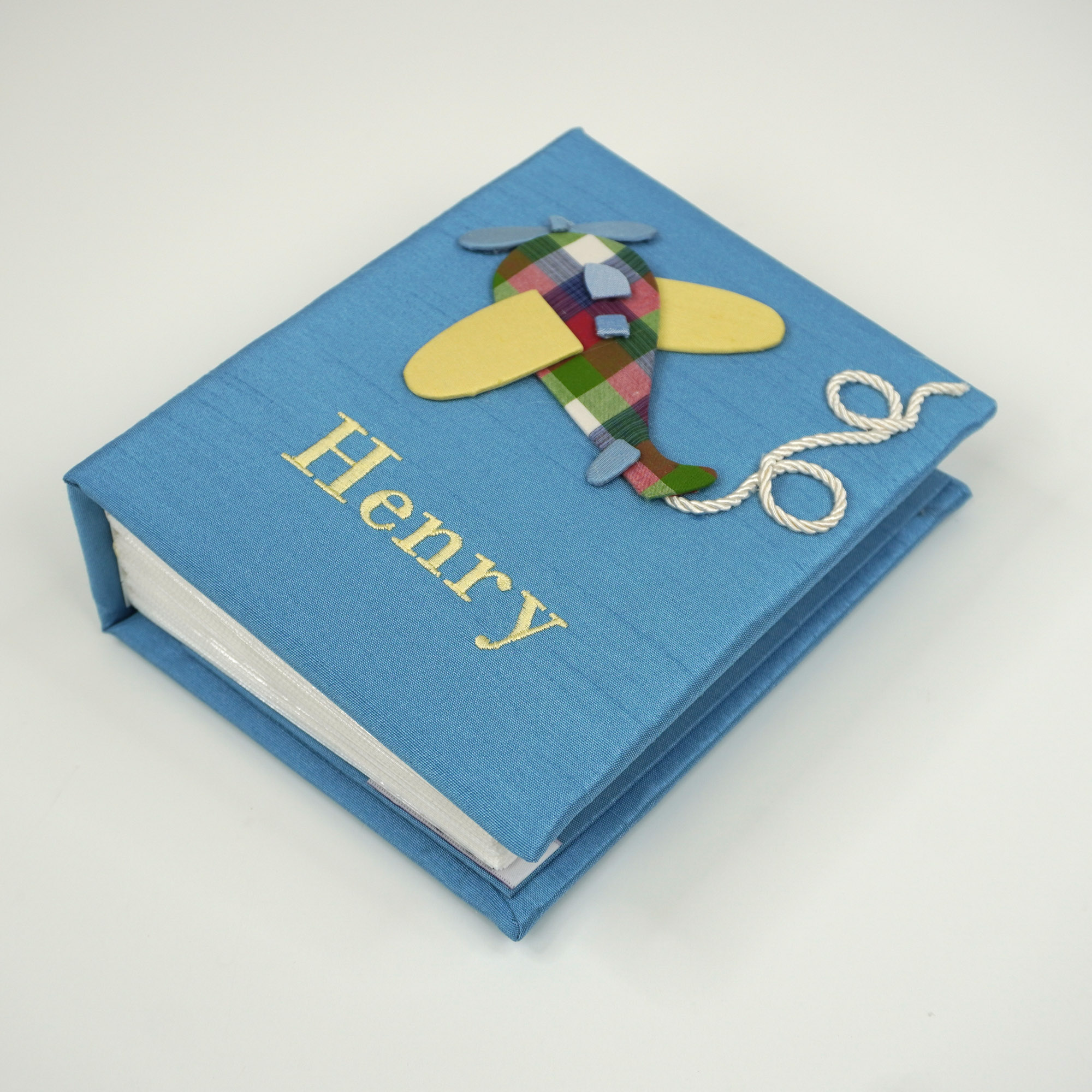 Your memories won’t be taking off, but your imagination can fly sky-high with this Small Hardbound Photo Album Shantung Airplane adorned to elegant fabric.Â